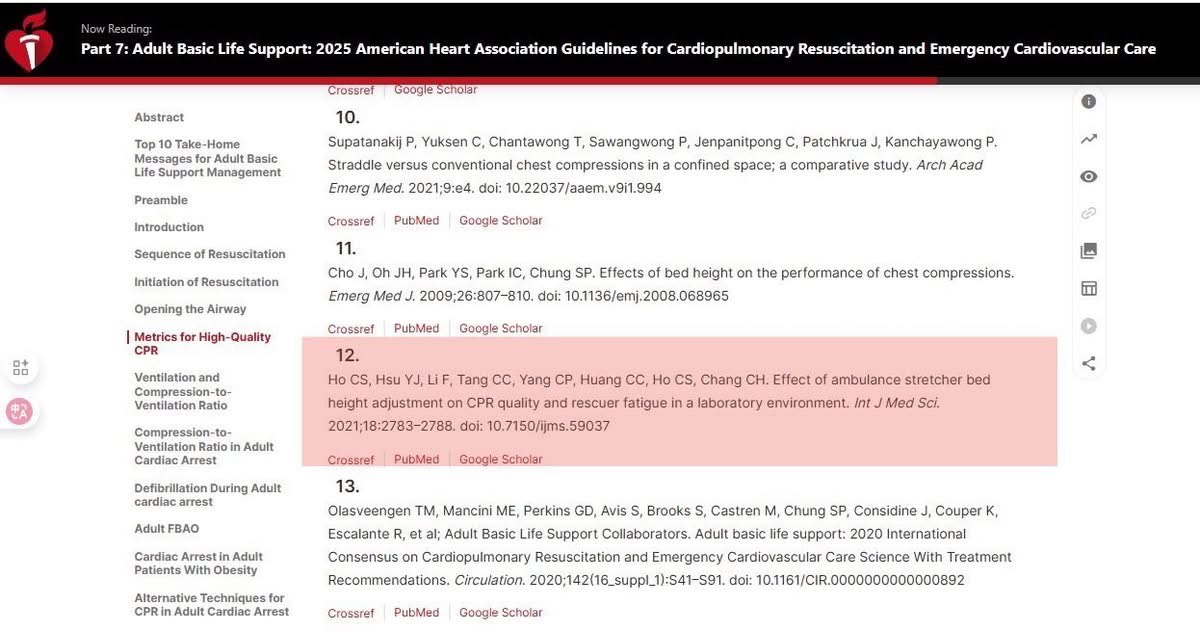 已被正式收錄於成人基本生命支持:2025 年美國心臟協會心肺復甦術和緊急心血管護理指引(Part 7: Adult Basic Life Support: 2025 American Heart Association Guidelines for Cardiopulmonary Resuscitation and Emergency Cardiovascular Care)。