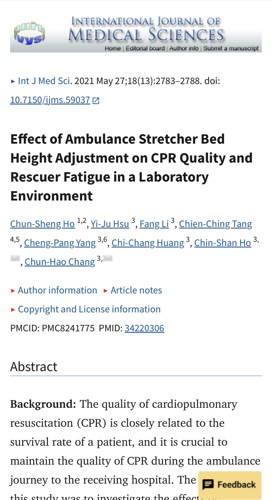 本所何金山教授(指導教授)、張淳皓助理教授、黃啟彰特聘教授、徐藝洳副教授兼所長與本院碩職班畢業生唐健清於2021年共同發表之國際研究期刊:Effect of Ambulance Stretcher Bed Height Adjustment on CPR Quality and Rescuer Fatigue in a Laboratory Environment.